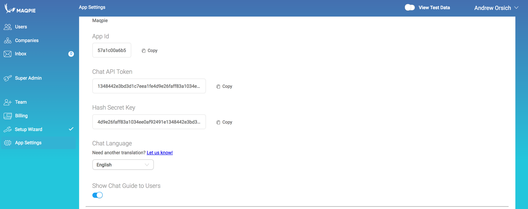 To start go to the App Settings on admin site and copy your API Token and AppId:
